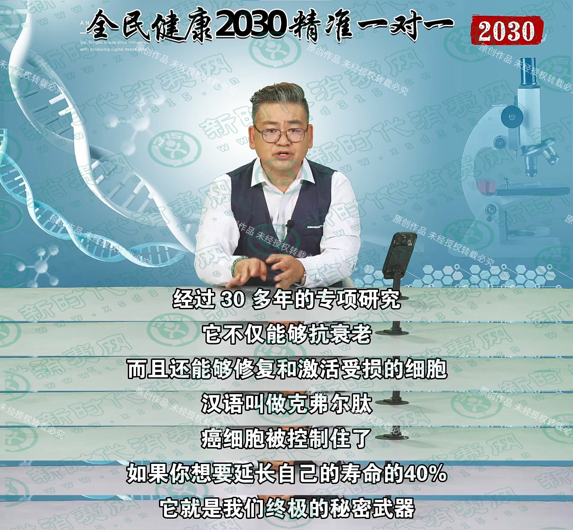 2025年以来,有多名消费者反映,在全国多个群聊中,出现一档《全民健康2030精准一对一》私域直播课,内容声称“KFET克弗尔肽由8位诺贝尔奖获得者、19位著名科学家鼎力推荐,激活长寿蛋白、延缓衰老、突破基因极限、延年益寿,让活到150岁不再是梦。”特邀嘉宾主讲人为张运杰,其在视频中显示的头衔有中国健康养老慢性病健康管理工程青年会员、中国文化科普大讲堂宣传部部长、三家爱心养老基地的董事长、黑龙江商会副会长等。经查,该课程存在如下问题: